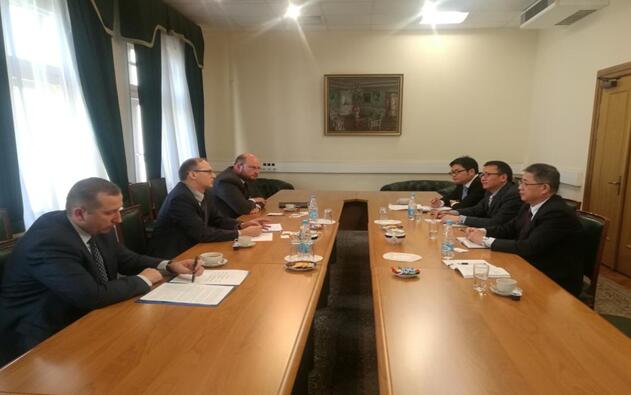 9月26日凌晨,调研团一行从莫斯科飞赴阿斯塔纳,拜访了哈萨克斯坦外交部。哈萨克斯坦外交部政策司、经济司两位司长及亚非司的官员接见了调研团一行,双方就目前两国合作中签证难的问题,以及如何实现在农业、中欧班列等多领域的合作进行了交流。